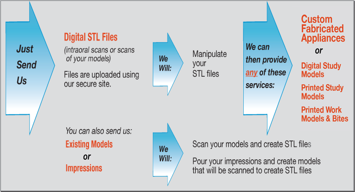 To create a digital model, we can work from your digital intraoral scans (STL files), or generate scanned files from your models, impressions, and bites. Your digital model can be customized with a selection of base options. You can also specify the degree of sculpting and refinement of the anatomy. This digital model can then be used to provide you with a full range of laboratory services.